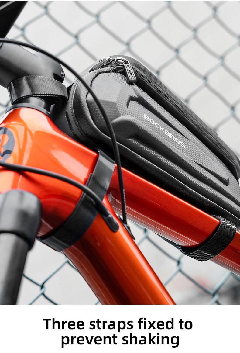 - EASY TO INSTALL & QUICK RELEASE: 3 straps are firm enough to hold up on the bike, 1 velcro commuter strap on the front + 1 longer commuter strap on the upper bottom( the long strap can fixed the bag on the head tube firmly) + 1 commuter strap on the lower bottom. The bicycle bag would not move around even if you ride on a bumpy or rocky road
